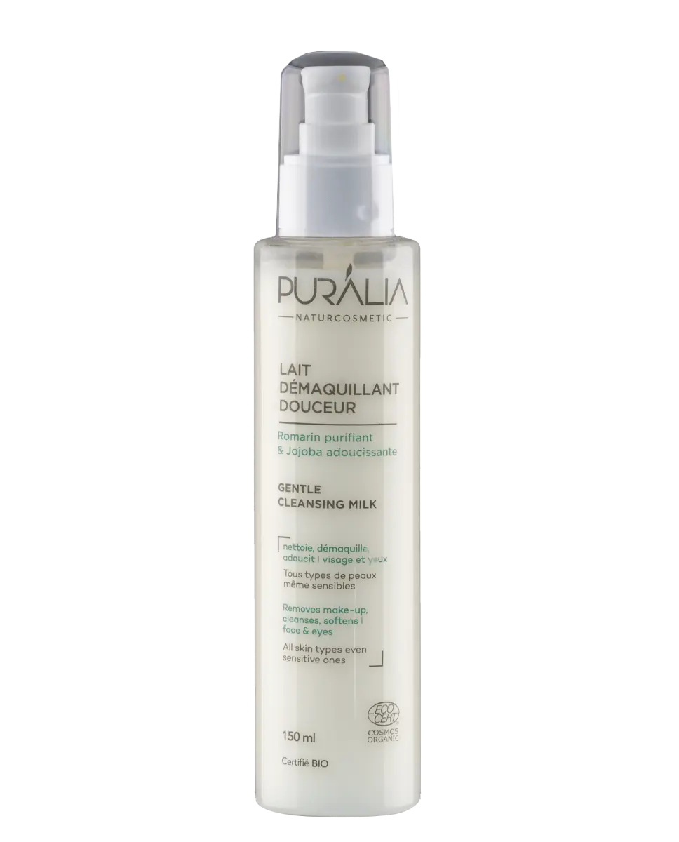 Le Lait démaquillant Puralia nettoie délicatement la peau et élimine les impuretés. Riche en actifs naturels, il laisse une peau nette et apaisée grâce aux propriétés purifiantes de l’hydrolat de romarin bio et adoucissantes de l’huile de jojoba bio.